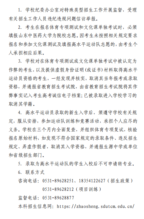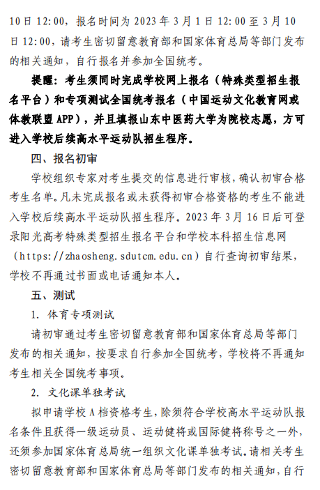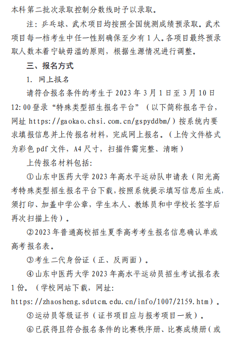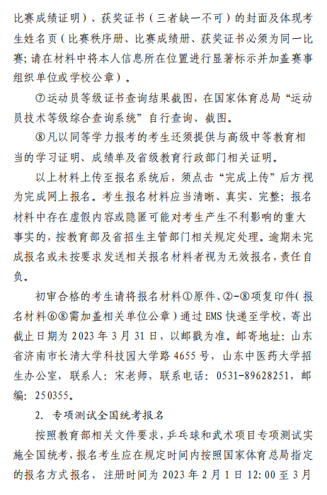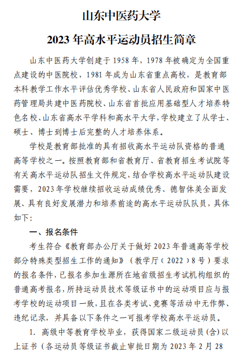 山东中医药大学2023年高水平运动员招生简章